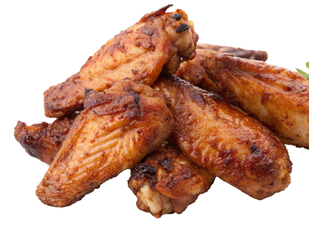 BBQ chicken wings, perfectly seasoned and cooked, offering a deliciously tangy and savory starter.