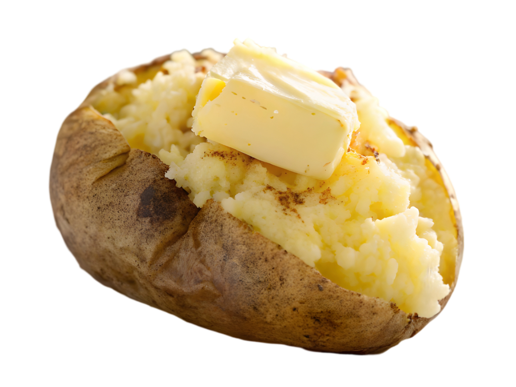 Fluffy baked potato served with creamy butter, a comforting starter to begin your meal.