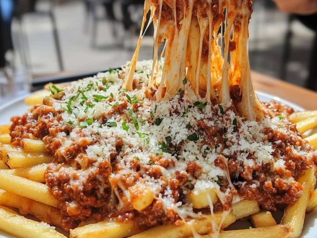 Bolognaise, Chips, Mozzarella Cheese, Red Onions, & Jalapenos