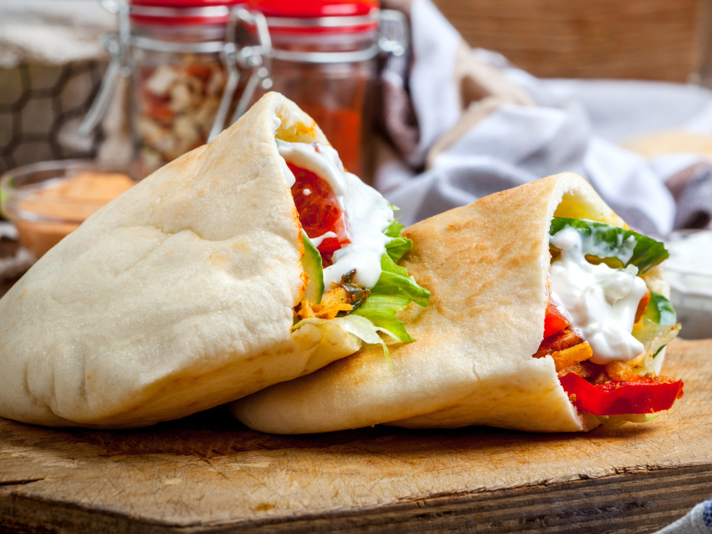 Fresh pitta bread paired with a crisp salad, perfect for a light and refreshing start to your meal.