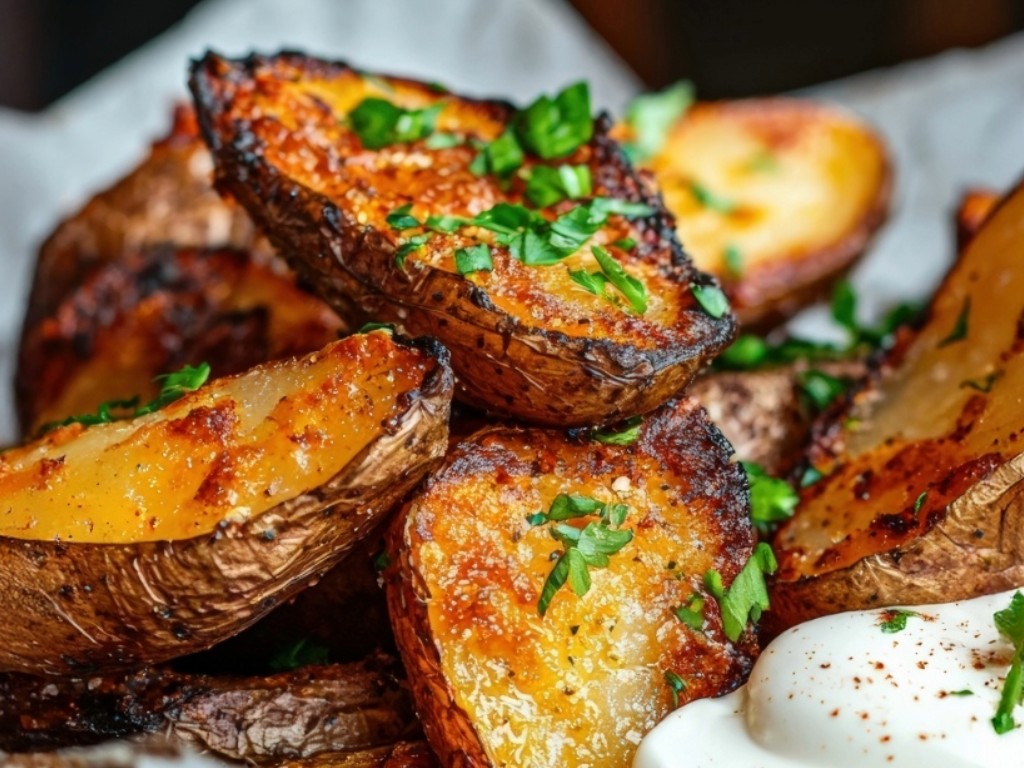 Ejoy our Potatoe Skins With Garlic & Cheese, a tasty starter in the Starters menu. Perfect for sharing or as a delicious snack.